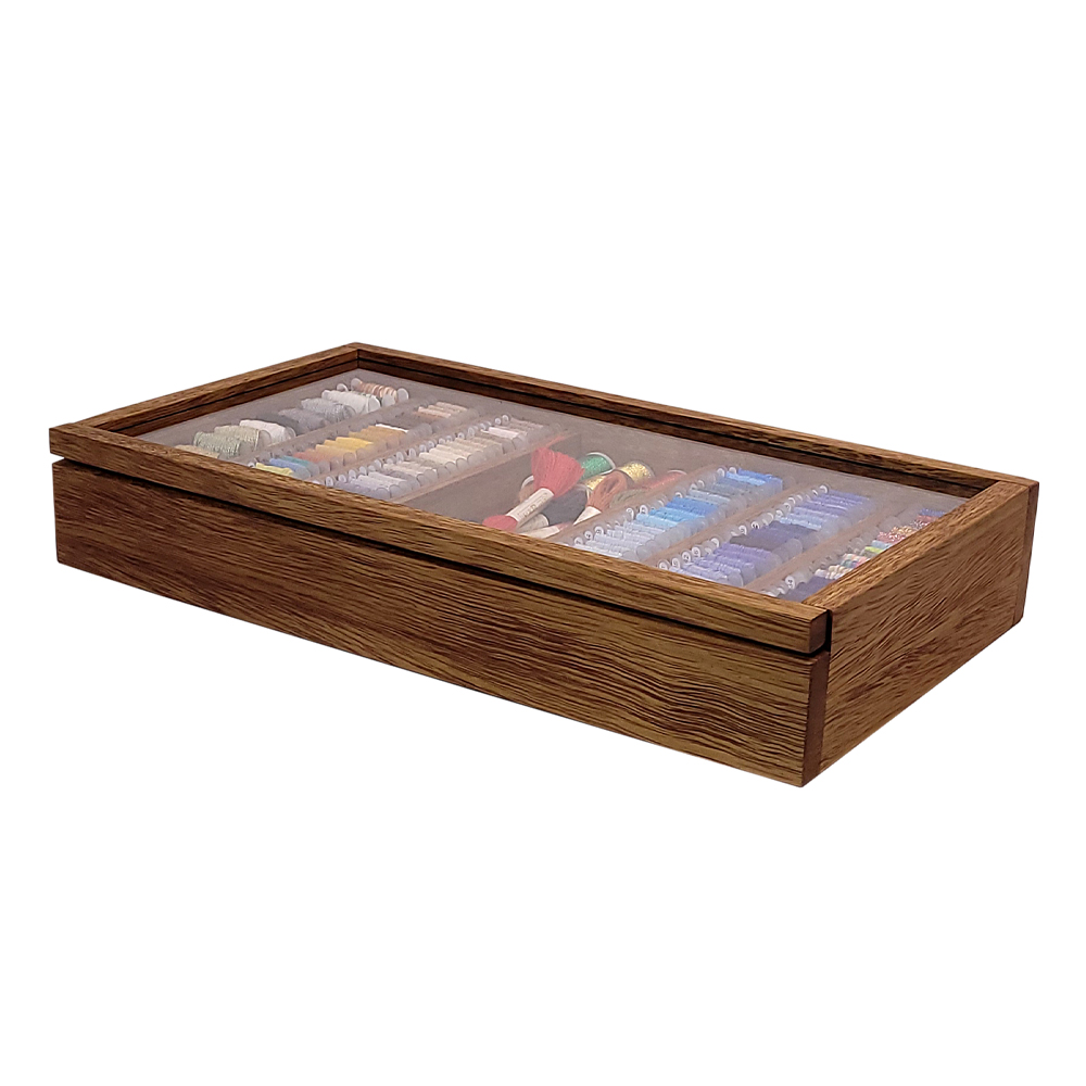 Projetada com linhas retas, além de ser uma peça que embeleza seu ateliê, a caixa oferece também uma estrutura bastante resistente, pois é produzido em Cedro Arana, uma madeira nobre e maciça que atribui maior robustez e firmeza à peça. Possui amplo espaço interno e divisórias que facilitam a organização de linhas e outros materiais de bordado. Conta também com um espaço central maior para guardar tesouras, dedais e outros materiais.