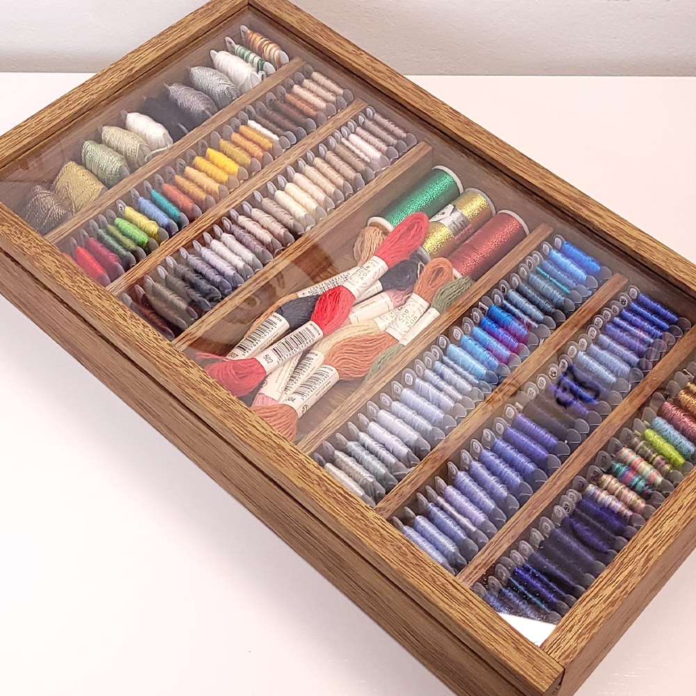 A caixa média possui 6 divisórias para guardar linhas tanto em plaquinhas como em meadas e uma divisória maior sem divisórias para guardar materiais maiores como tesouras, dedais e canetas. Sua organização torna muito mais fácil e prazeroso escolher e encontrar o material que necessita na hora de bordar.