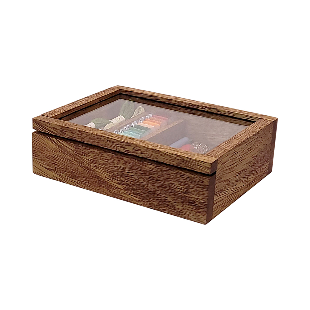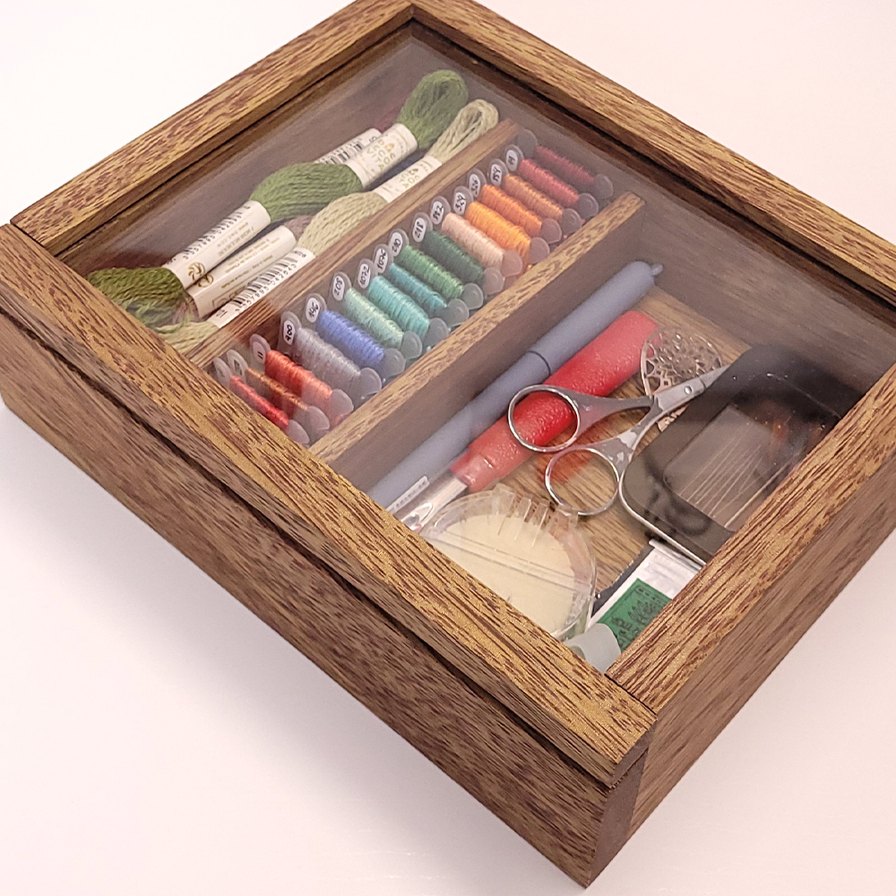 A caixa pequena possui 2 divisórias para guardar linhas tanto em plaquinhas como em meadas e uma divisória maior sem divisórias para guardar materiais maiores como tesouras, dedais e canetas. Sua organização torna muito mais fácil e prazeroso escolher e encontrar o material que necessita na hora de bordar.